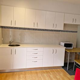 · Spacious shared kitchen with gas cooking and a large refrigerator.